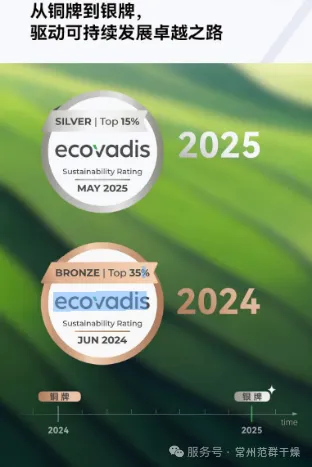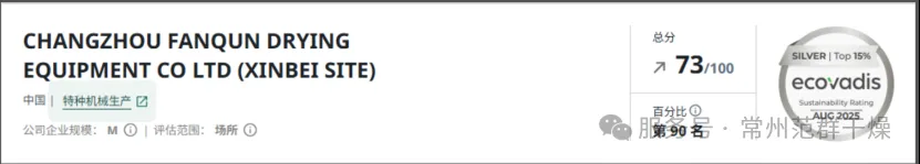 2025年8月,常州市范群干燥设备有限公司实现了ecovadis评级跃升,成功摘得银牌认证,跻身全球评级企业前15%,这是对常州范群在环境保护、劳工与人权、商业道德、可持续采购等方面的持续努力的充分肯定,创造企业历史最佳成绩。